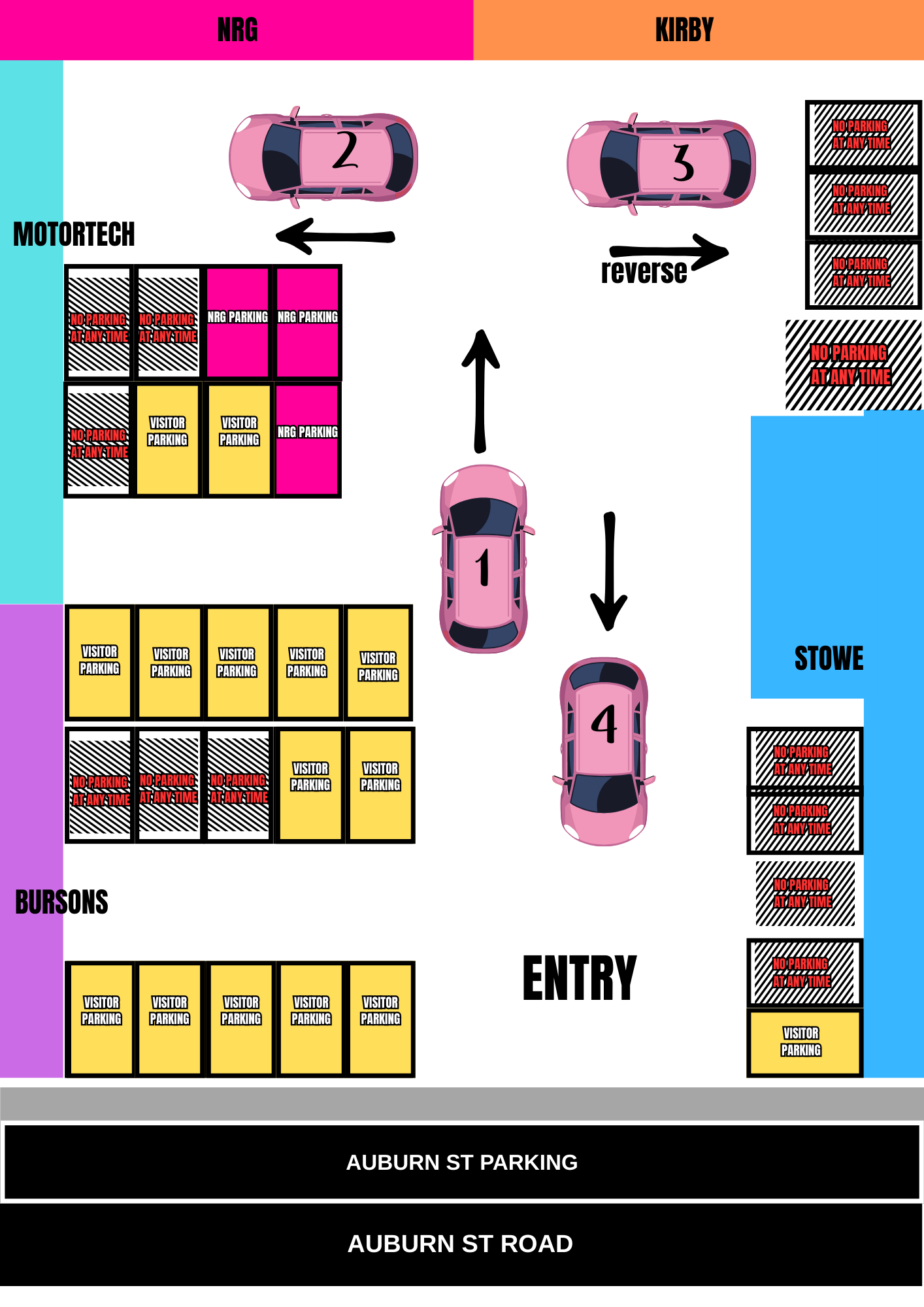 and walking through the carpark. There are 3 parking spaces allocated to NRG Studios and
